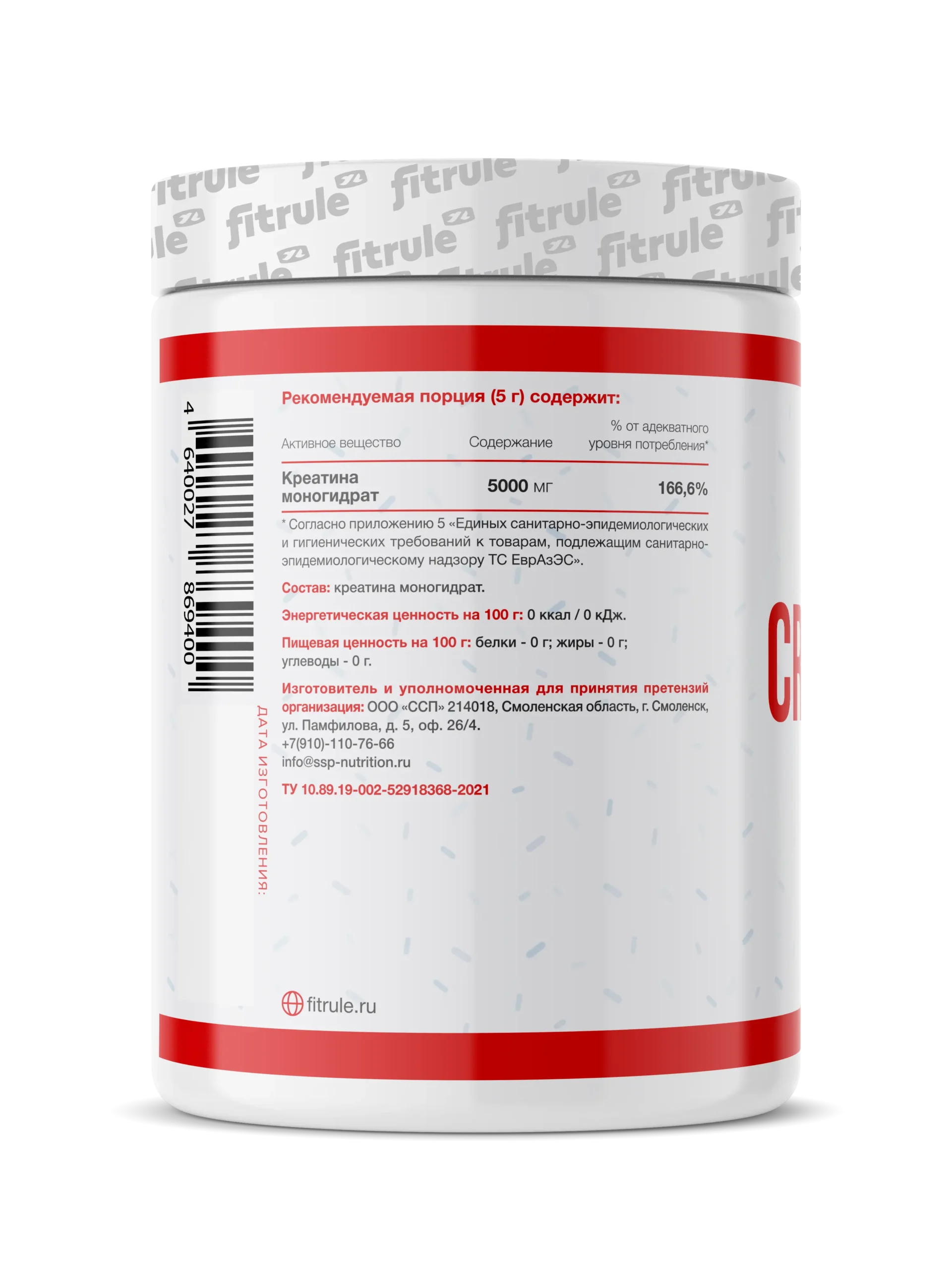Fitrule Creatine Monohydrate (Креатин Моногидрат) – самая важная добавка спортивного питания для силовых и скоростно-силовых видов спорта. В организме из креатина активно образуется энергия (АТФ), которая расходуется с большой интенсивностью в короткий промежуток времени. Благодаря этому свойству креатина, мышцы могут проявлять силу и скорость, а также развивать и совершенствовать эти показатели с ростом уровня тренированности.